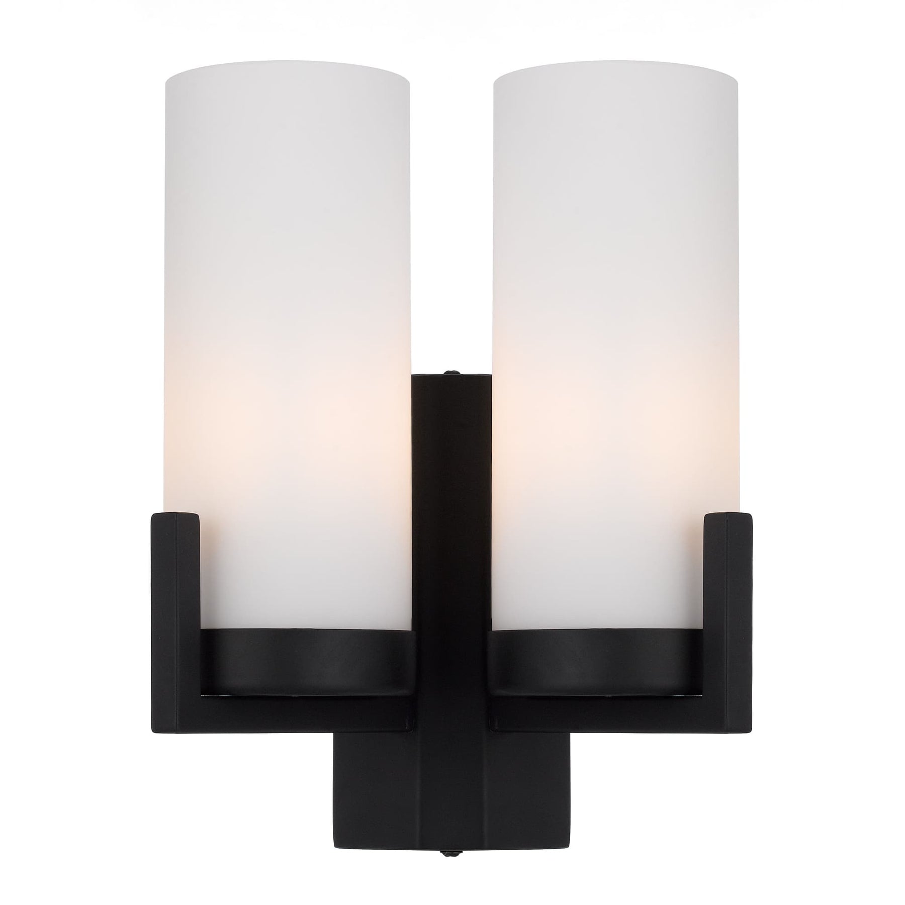 The Eamon Wall Light is handcrafted, with a black frame supporting two mouth-blown opal matt cylindrical shades that glow when lit.